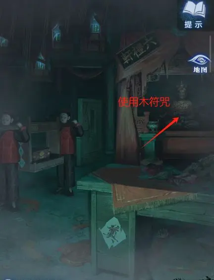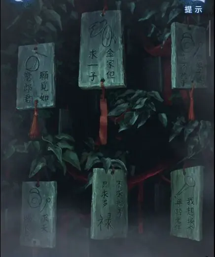 1、点击纸人庙上的牌匾,获得【龙凤花烛】;点击窗户,获得【朱砂香囊】,同时注意许愿牌的位置和上面的图案。