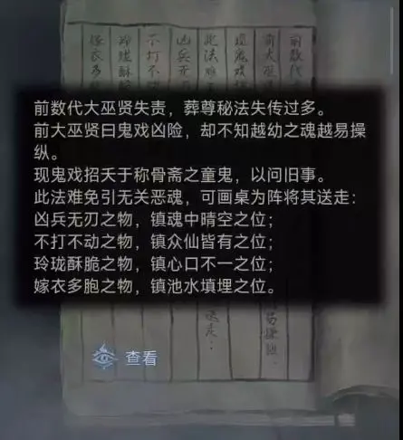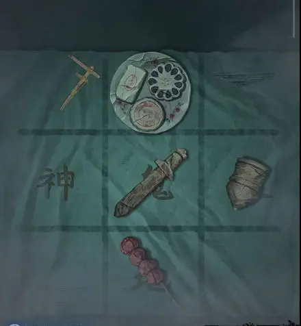 将纸扎剑放入中间的桌面上触发小游戏,根据线索 “天位是糕点,鬼位是剑,地位是糖葫芦,人位是陀螺” 完成后,获得【玩具枪】。