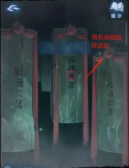 14、进入送喜阁,点击正上方的棺材,将【长命锁】挂在最右侧棺材的钉子上面,获得线索。点击右侧的架子完成小游戏后,将【盖头】给出现的人,获得【木梳】。
