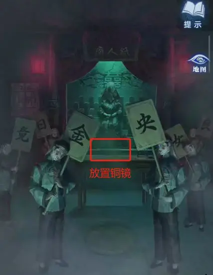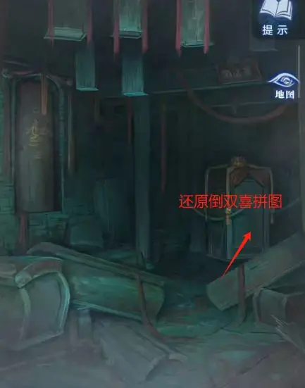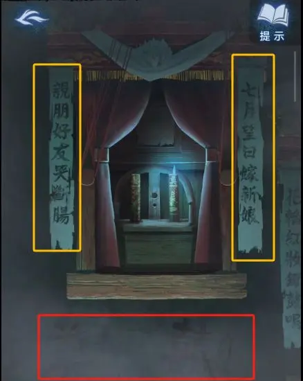 3、从左往右拉视角,根据提示调整蜡烛的状态为 “点燃熄灭,熄灭点燃,点燃熄灭,熄灭点燃”。提示信息为 “奠” 字边上画着点燃的蜡烛,“囍” 字边上画着熄灭的蜡烛,可通过对联判断,如 “亲朋好友哭断肠”→奠,“七月望日嫁新娘”→囍等。调整完毕后,拾取花轿里的【梳妆镜】和【无面铜人】。