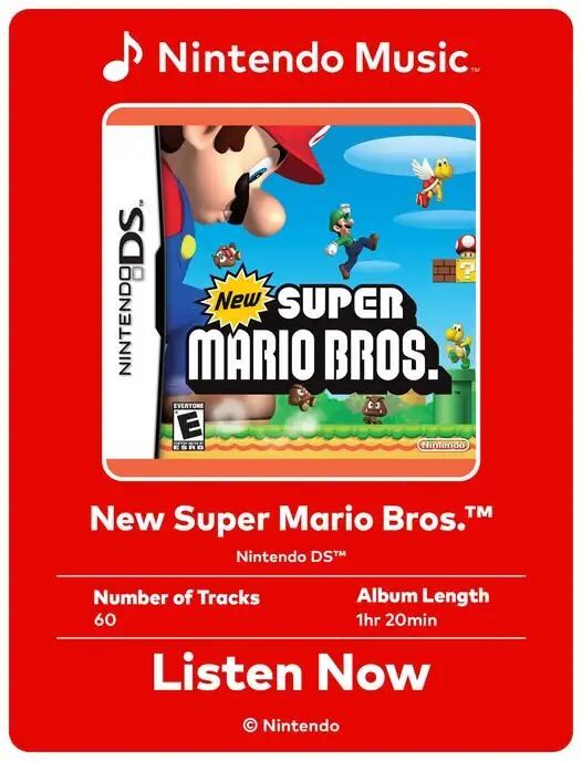 任天堂音乐App今天更新NDS游戏《新超级马力欧兄弟》原声带,包含60首曲目,时长1小时20分钟。