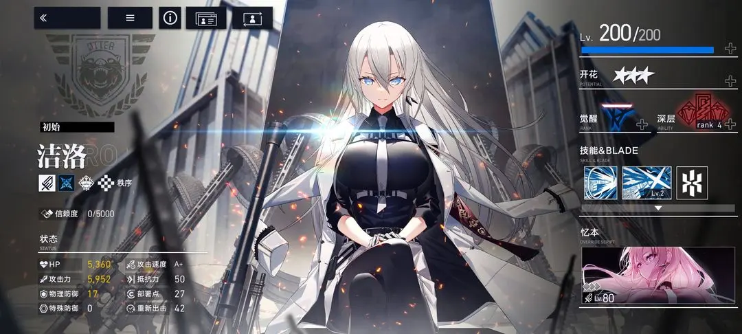 1.初始洁洛强度 初始洁洛在获得专属粉色忆本后产生质变,输出能力达到顶级水平,是下塔挑战中优先培养的核心角色。其白色制服的外观特征明显,玩家可以轻松与其他形态进行区分。