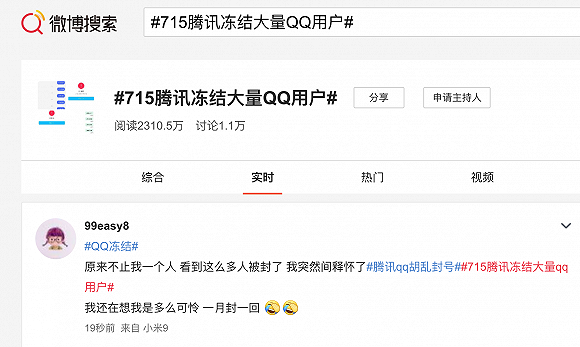 7月15日下午,大量用户在微博反馈其QQ账号被无故冻结,且无法解冻,有用户称通过人脸识别寻求解封时,腾讯客服无法转接人工。目前,腾讯尚未就此事作公开回应。