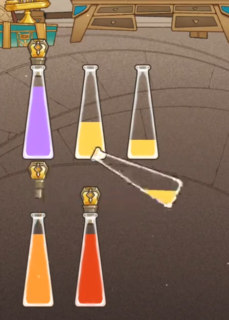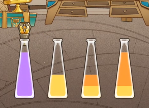 在分离水彩的途中,玩家需要不断点击两个不一样的试验瓶,如此便会把一个瓶子顶层的颜色倒至另外一个瓶子里面。一个瓶子顶多可以容纳四种液体,当全部液体都满了之后,就会制动将瓶盖合上。到了最后还要看最终的步数是多少,才能决定最终的分数。