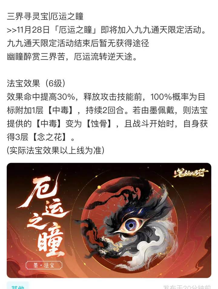 11月28日厄运之瞳将正式加入九九通天限定活动,届时玩家可参与活动获取这一强力法宝。