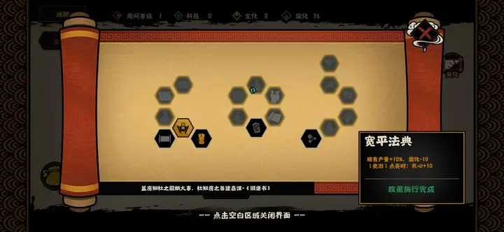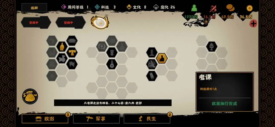 进入政策界面后,别急着乱点。先点科技消耗士子,把科技发展起来,后续再点其他民生政策。具体能点哪些民生政策,可以参考游戏内的图示说明。