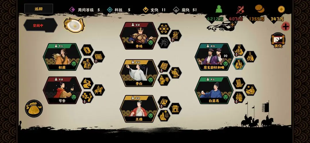 进游戏后别犹豫,第一时间进入政策或者名臣界面卡住时间流速。这一步很关键,能防止孙思邈、玄奘这类无关名臣突然冒出来,打乱刷碎片的节奏。要是你本来就打算刷这俩,那这条可以忽略。