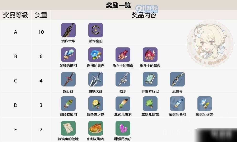 奖品一共分为五个档次(A、B、C、D、E),其中A档奖品最为稀有,而E档奖品最普通。不同档位的奖品负重是不同的,关于负重机制,之后会详细说明。