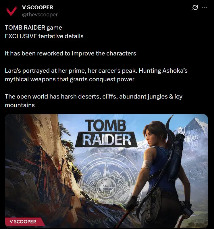 推特用户V Scooper澄清说,《古墓丽影》新作已经过大幅修改,以提升角色塑造。劳拉将以她事业的巅峰时期形象出现,塑造了一个更加成熟的劳拉·克劳馥形象。游戏的开放世界包含各种生物群落,例如严酷的沙漠、悬崖、丛林和冰雪覆盖的山脉。此前泄露的信息显示,游戏背景设定在印度北部,玩家可以与其他角色结盟进行团队游戏。