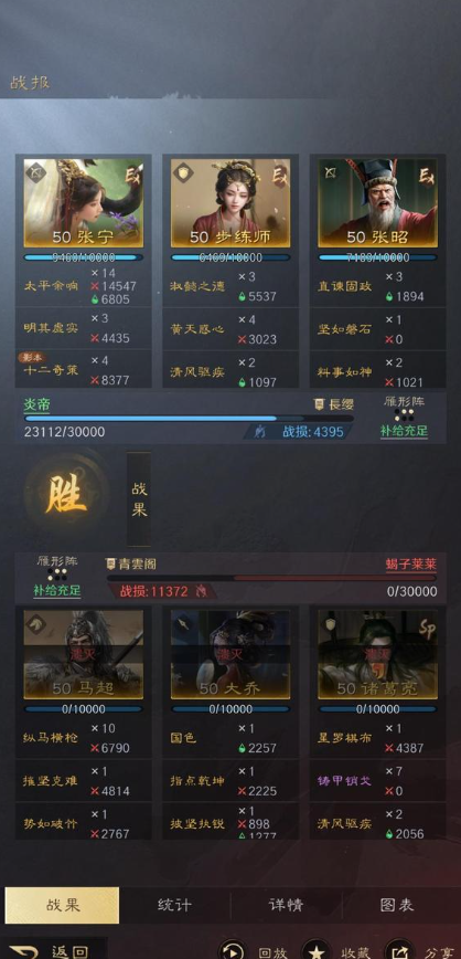 平均6回合前结束战法,优势,均势皇甫嵩和张宁,小优司马老姜维,大优兵刃,稳定清杂。队友战法同皇甫嵩,不再赘述。此外无董卓和皇甫嵩时,可以用夏侯惇来cos,带一摸一样的战法即可。