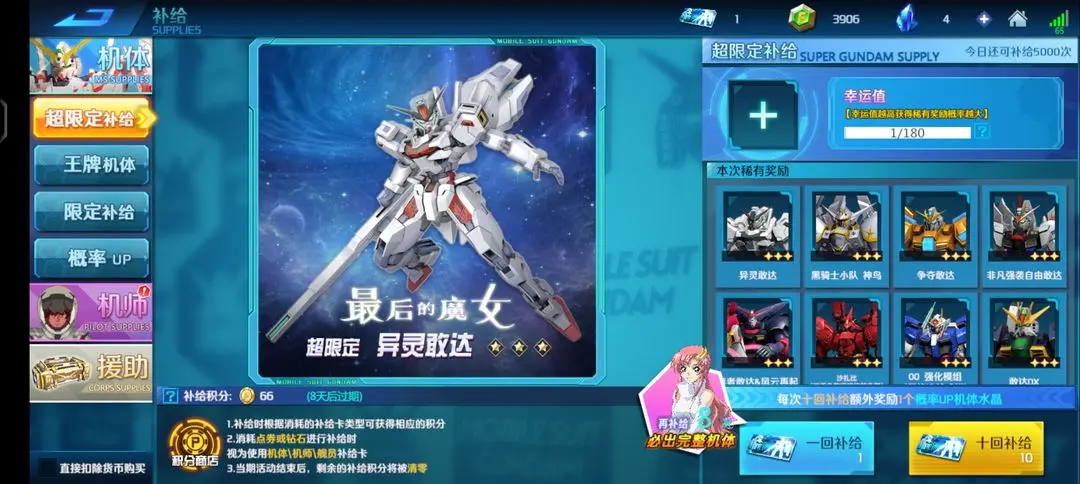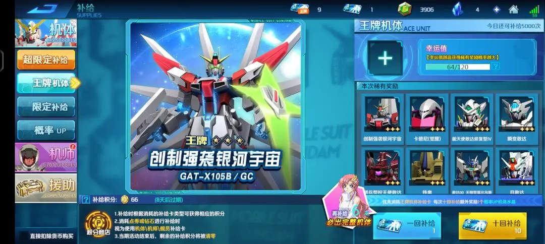 1.目前有3900点券,是抽王牌机体还是把周年活动积分攒一点换补给卡再肝一会儿抽超限?超限已经有一个菲尼克斯了
