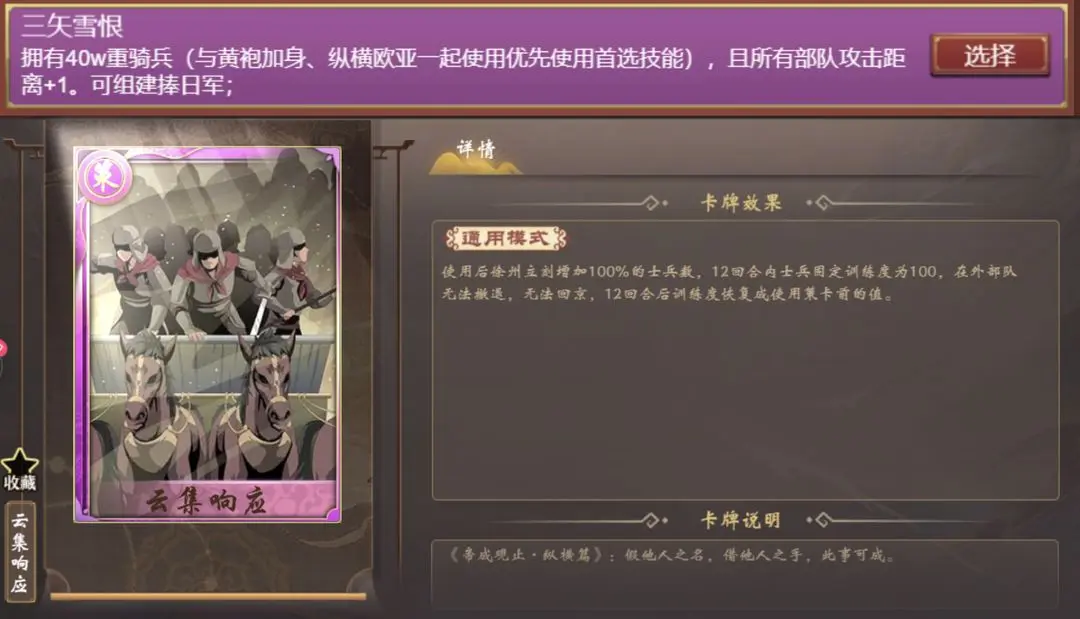 携带天命:三矢雪恨上朝让士兵回京,然后使用策卡云集响应。