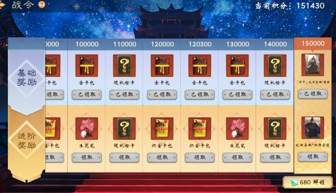 战役每一层需要2个生花笔解锁,把每层的困境全部点满则只需要打14层,共计22个生花笔即可获得黑金卡曹操。白色时空2,3关在没有点兵的情况下需要300谋略直接解锁。由于前面的困境条件都拉了一些所以第五关直接不用解锁。