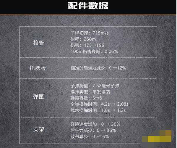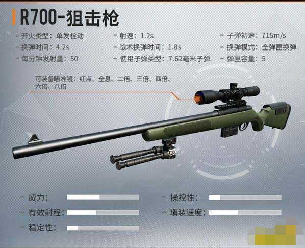 射击精度高,射程远,单发威力强的专用步枪。拥有最高的单发伤害和射程,缺点为弹匣容量较小,更换弹匣速度较慢,射速较慢,不太适合持续输出