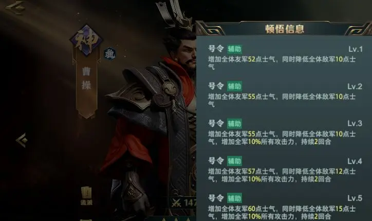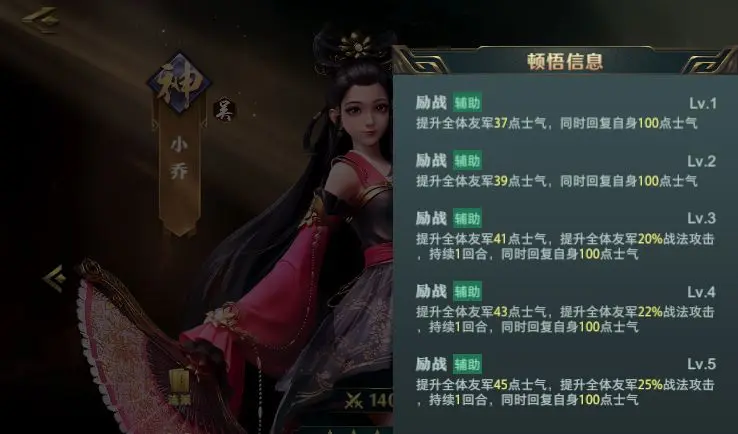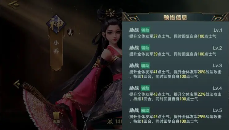 曹操的【魏武之威】回复全体40点士气并降低敌方10点士气,小乔的【擂鼓助威】额外回复37点士气。两者组合可实现首轮全员技能释放。第二轮时需注意曹操速度需高于小乔,通过【号令】兵书提升士气回复量,确保持续作战能力。