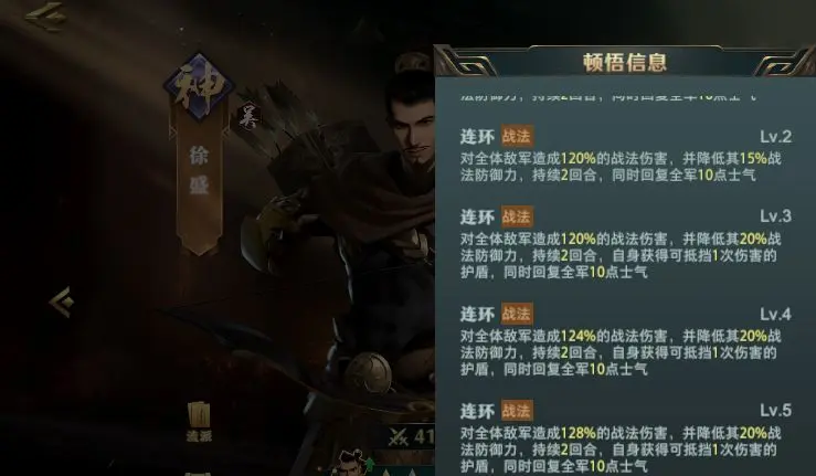 小乔的【战意鼓舞】提升全体25%战法攻击,徐盛的【破阵摧坚】在造成280%战法伤害的同时降低敌方15%战法防御。两者组合可使战法伤害提升近50%。关键在于小乔需佩戴【疾风】马匹确保首轮释放技能,徐盛则携带【破军】兵符强化破防效果。