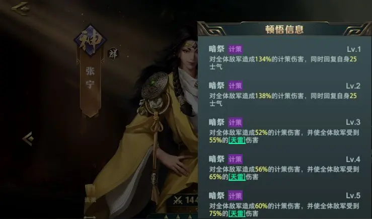 张角顿悟三阶后解锁【阴云蔽日】,施加持续2回合的易伤效果。张宁的【五雷轰顶】在造成伤害的同时触发天雷,与阴云形成双重增伤。该组合需确保张角速度领先,建议装备【先机】兵书提升先手概率。