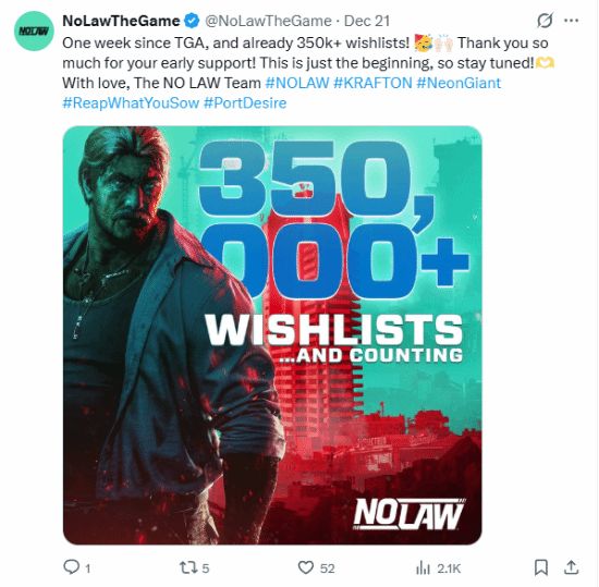 3A开放世界生存新作NO LAW在2025年TGA颁奖典礼上首曝即引爆全场,这款由PUBG发行商KRAFTON与瑞典Neon Giant工作室联合打造的硬核大作,凭借虚幻5引擎打造的赛博港口都市与高自由度玩法,首周Steam愿望单便突破30万大关,成为2025年最受期待的开放世界生存游戏之一。