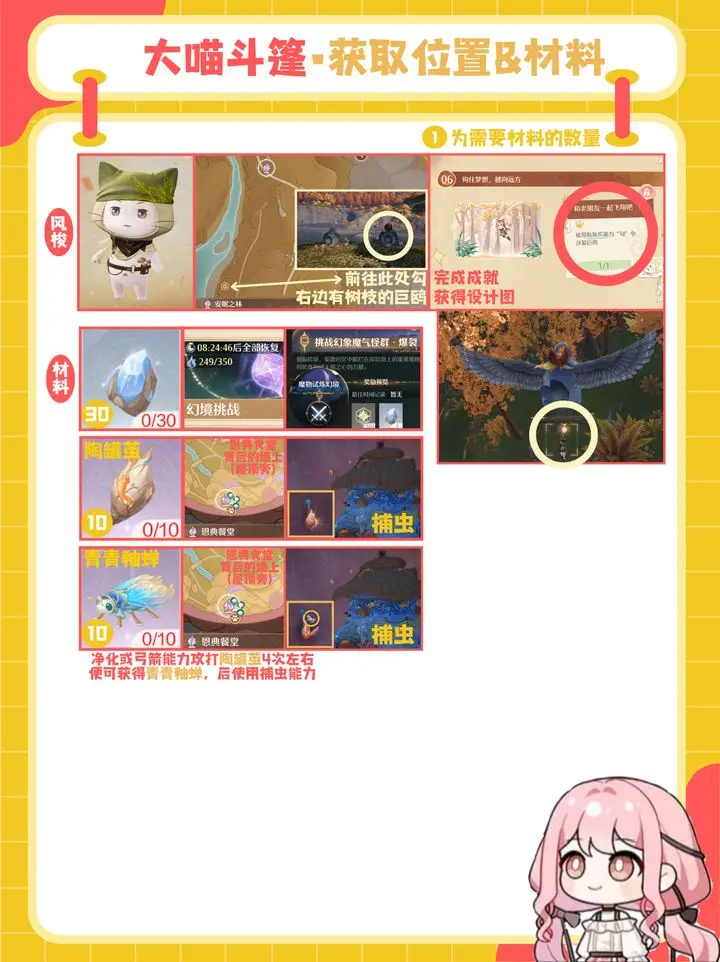 这款斗篷同样与成就系统绑定。你需要完成“踏入伊赞之土的脚步”系列中的另一个成就“钩住梦想,越向远方”,其目标是使用黏黏爪成功钩中一只浮絮巨鸥。成就完成后,即可收集材料制作斗篷风梭,所需材料包括:10个陶罐茧(野外直接采集)、10个青青釉蝉(通过打破陶罐茧捕捉获得)、30个大地晶珀·帅气(在伊赞之土探索收集)以及300个丝线。