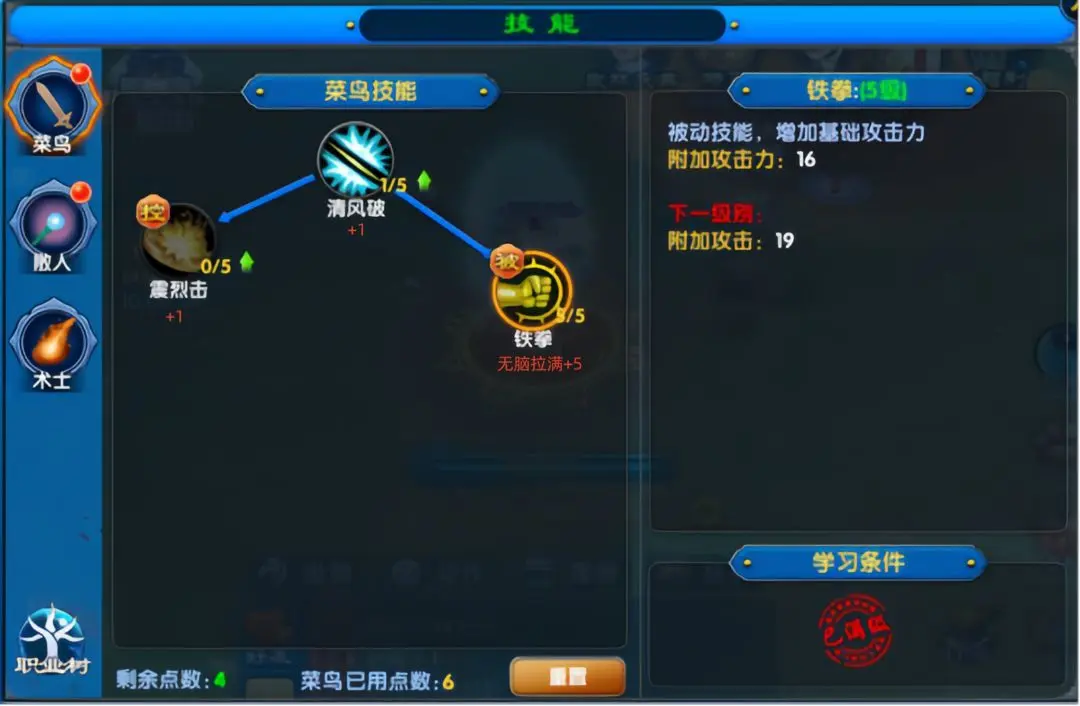 清风破加1点,用于前期过渡即可。震裂击加1点,铁拳则无脑拉满,可提供大量攻击,增强前期战斗能力。