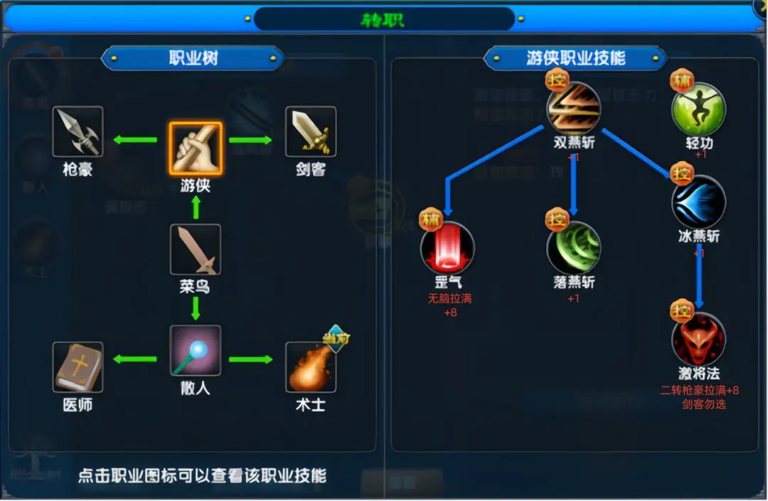 玩家前30级按此加点,进行二转后可获得技能重置符,将菜鸟以及游侠技能全部重置后重新加点。主要为清风破1点、罡气5点、双燕斩1点、罡气再补8点(累计罡气13点)、轻功1点、激将法8点,总共消耗24点技能点,剩余技能点用于后续升级枪豪职业的技能。