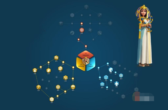 发展方向可以是群体buff辅助类或者是纯采集类。建议是走纯采集向,然后当副将用。将采集向的蓝色天赋都点满,只加采集天赋,培养艳后到37级差不多就够了。一把搭配其他采集武将使用,善德女王或者石田三成加上埃及艳后可以蹲资源点打。值得一提的是埃及艳后在日落峡谷也有一定的发挥。