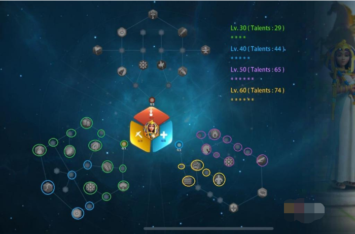 有两种培养方向,一种就是群BUFF辅助型,另一种是纯采集型,建议将其作为副将搭配,天赋的话主采集路线,副辅助路线,搭配其他采集将或者善德女王比较实用,下面就是两种方向的天赋加点图。