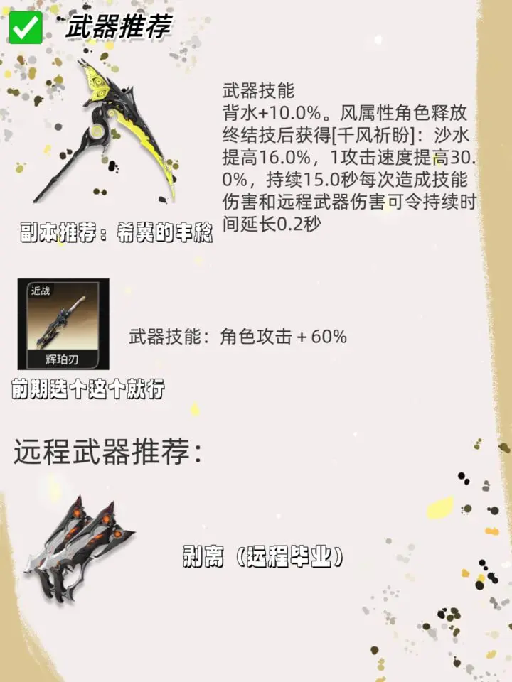 毕业武器首选希冀的丰稔,也就是赛琪的专武。它能为赛琪提供高达90%的技能威力加成,还有背水效果,极大增强赛琪的战斗能力。要是暂时没有专武,过渡可以选择枯朽,它能提供48%的技能威力,通过主线任务或者密函就能获取。对于新手玩家来说,辉珀刃是不错的开荒选择,暴击时能回复神智,帮助新手更好地应对前期战斗。