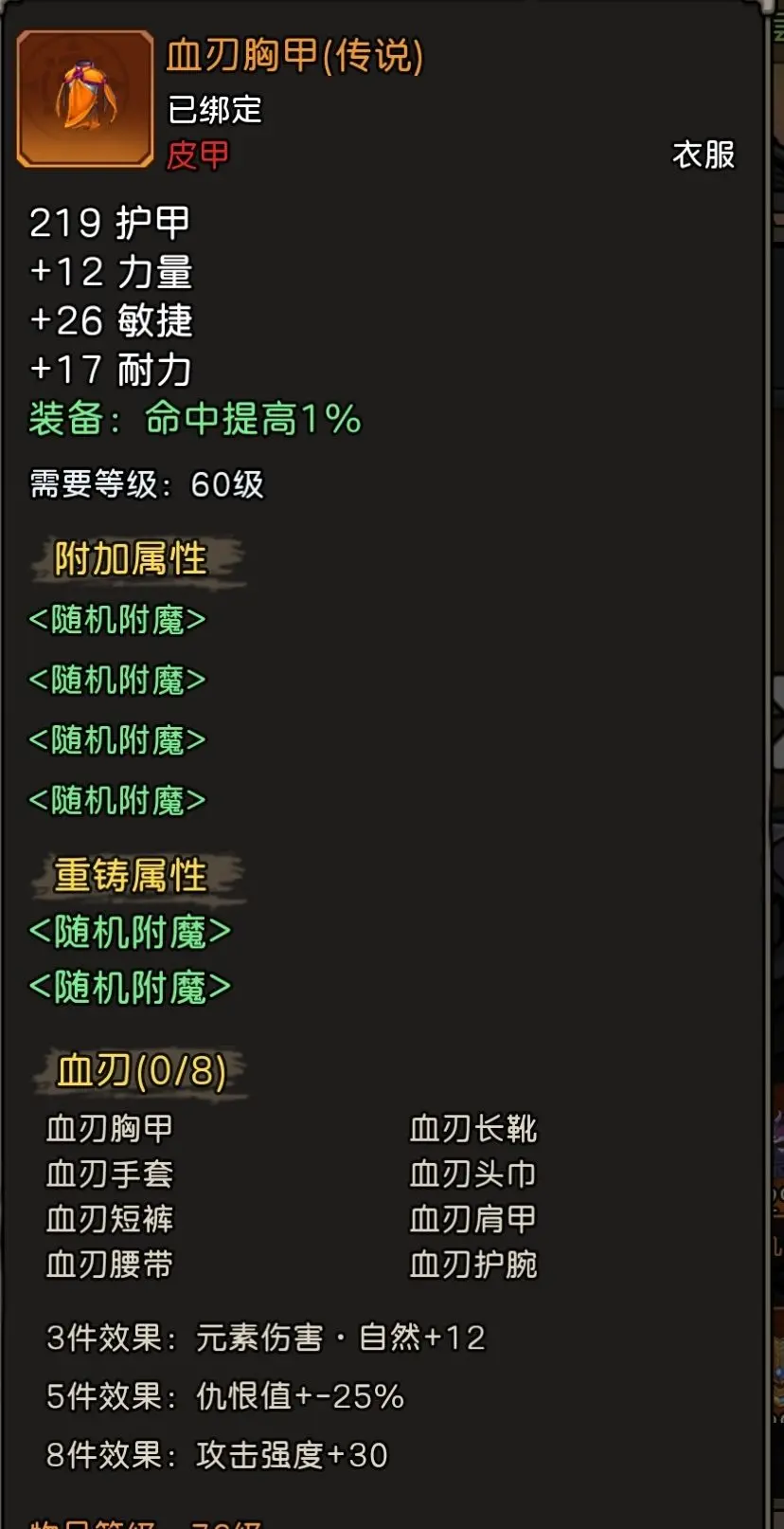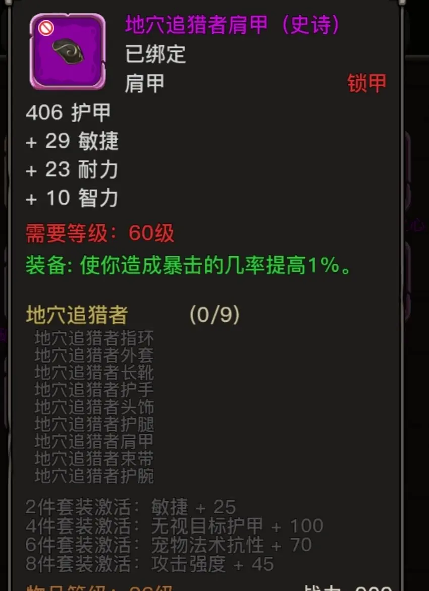 黑龙副本(巅峰100)前,以元素和特效装备为主。巅峰100后猎人进入发力期,熔火加黑龙阶段,3巨龙追猎加3血刃都行,肩膀用地核,头部选火焰头盔。虫心阶段,3血刃加3死亡执行者,再搭配极品散件。要塞阶段,3血刃加3死亡执行者加2地穴,地穴追猎者3套装敏捷加成高。装备颜色选橙色,因为重铸属性有两条,猎人能穿锁甲,选择面比布甲职业大。