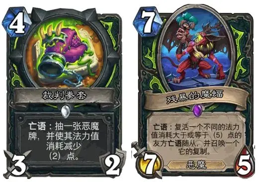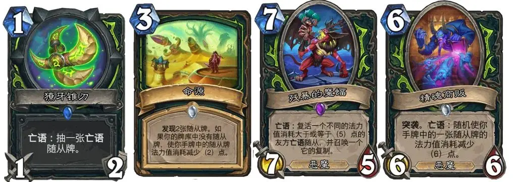 2费跳脸惊吓后期爆发续航,检索黑赐大恶魔,别当2费过牌,是高费补资源决胜牌;3费命源核心减费key牌,天胡有命源+精魂+魔蝠+退货组合;3费退货政策回收魔蝠实现套娃循环。