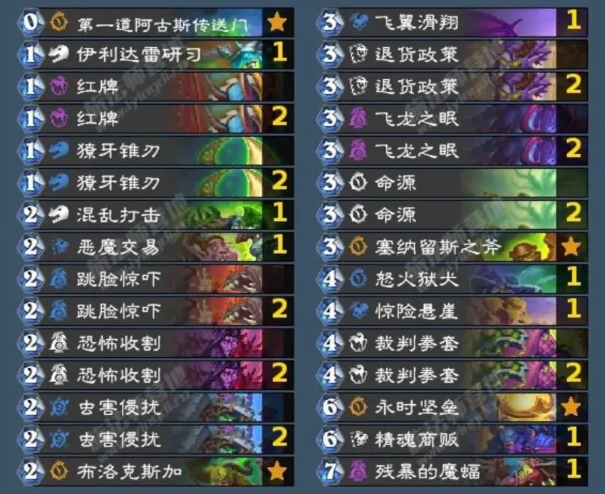 0费第一道阿古斯传送门,压缩牌库完成小任务,助精魂送掉;1费伊利达雷研习检索法术,獠牙锥刃解场定向过牌,红牌低费软控;2费布洛克斯加压缩牌库,恐怖收割铺场过牌,恶魔交易解场回血,混乱打击解场过牌,虫害侵扰高效解场。
