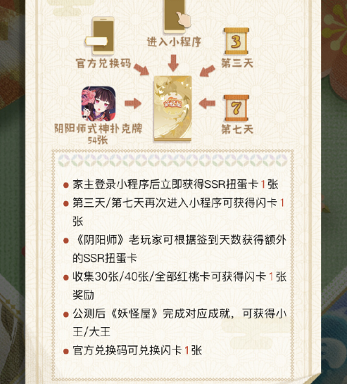 第三天、第七天进入可获得闪卡1张,收集30、40、全部红桃卡可获得闪卡1张,公测后妖怪屋完成对应成就,可获得小王、大王,兑换码可兑换闪卡1张。