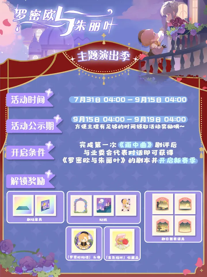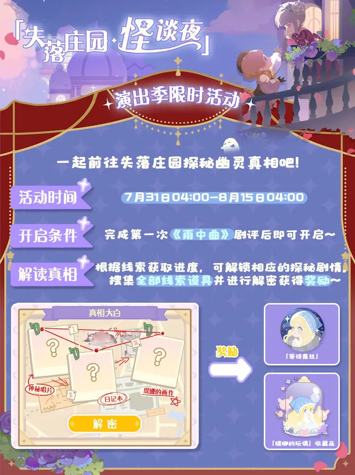7月31日至9月15日将开启罗密欧与朱丽叶主题演出季,同期推出失落庄园怪谈夜解密活动。本文将为玩家详细介绍活动内容与参与方式。