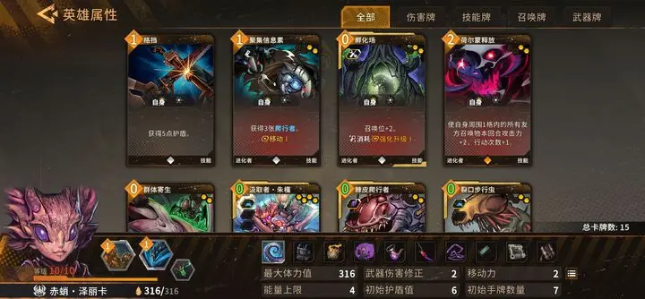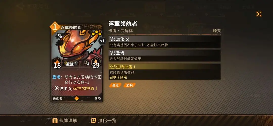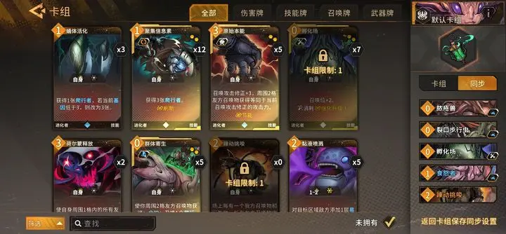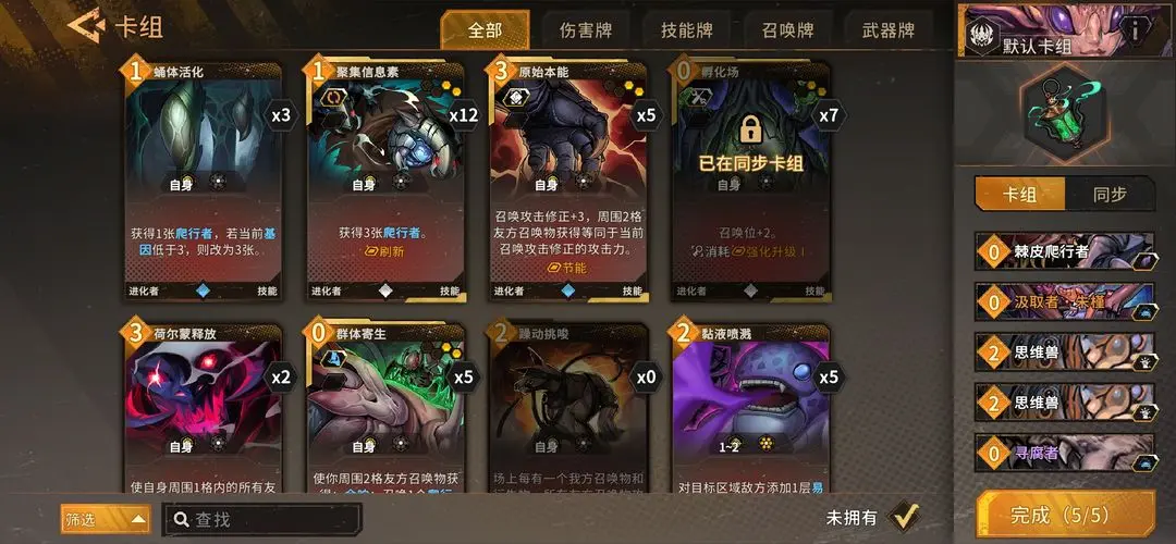 基本思路是多招进化召唤物,叠加召唤物攻击,增加进化召唤物出手次数。主要打法是先弄一个非进化召唤物或带减费的0费召唤物,没有就用技能招爬虫,再招其他进化召唤物,不够时用思维兽从牌库拉进化召唤物,使基因到5。接着招专属卡汲取者,她进攻距离为2且有进化,随回合成长,对持久战很重要。此时要注意召唤位,最好带孵化场。最后招浮翼领航者,他能让所有召唤物攻击次数加1,升满级后加2,让一群召唤物围攻敌人。