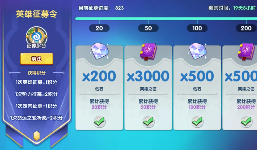 开启条件是新手英雄集结活动结束或提前完成的第二天,第一个月需2000分,后续每月2万分,每月1号刷新积分和任务进度条。