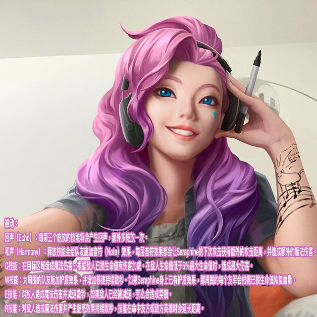 Seraphine的技能会给予周围的友军音符,持续x秒,每个音符都能让Seraphine的下次普攻获得额外攻击距离和额外魔法伤害;