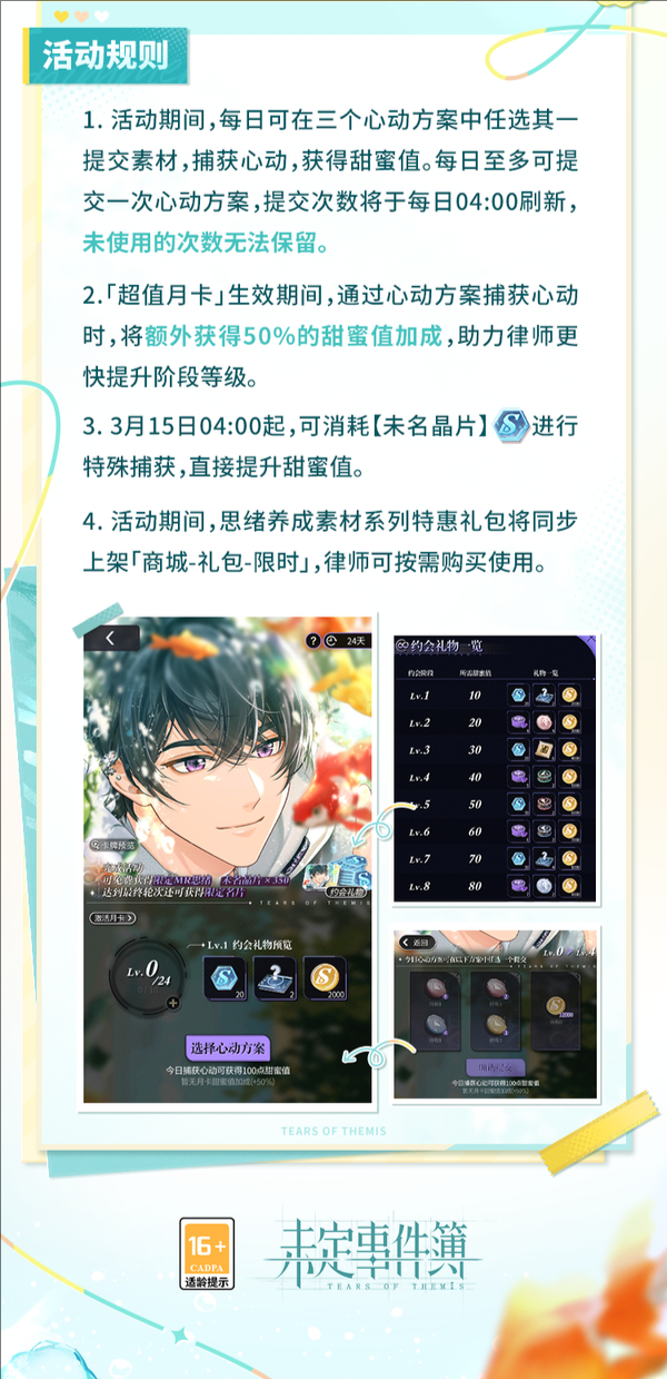 活动期间,律师每日可选择不同的「心动方案」并提交相应素材来捕获心动,进而获得甜蜜值。