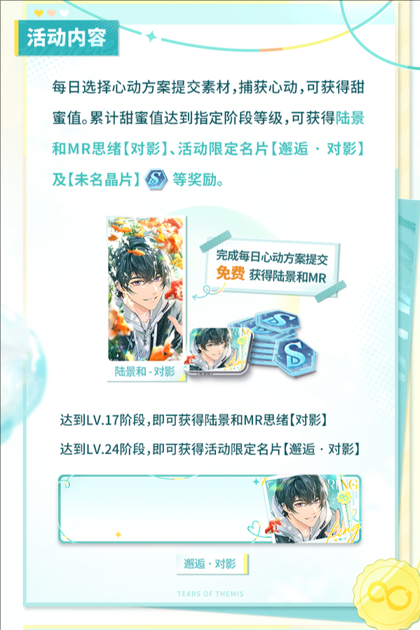 累计甜蜜值达到指定阶段等级后,律师可获得陆景和MR思绪【对影】、活动限定名片【邂逅 · 对影】以及【未名晶片】等丰厚奖励。