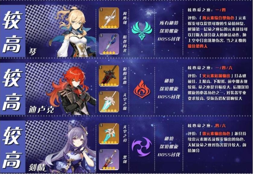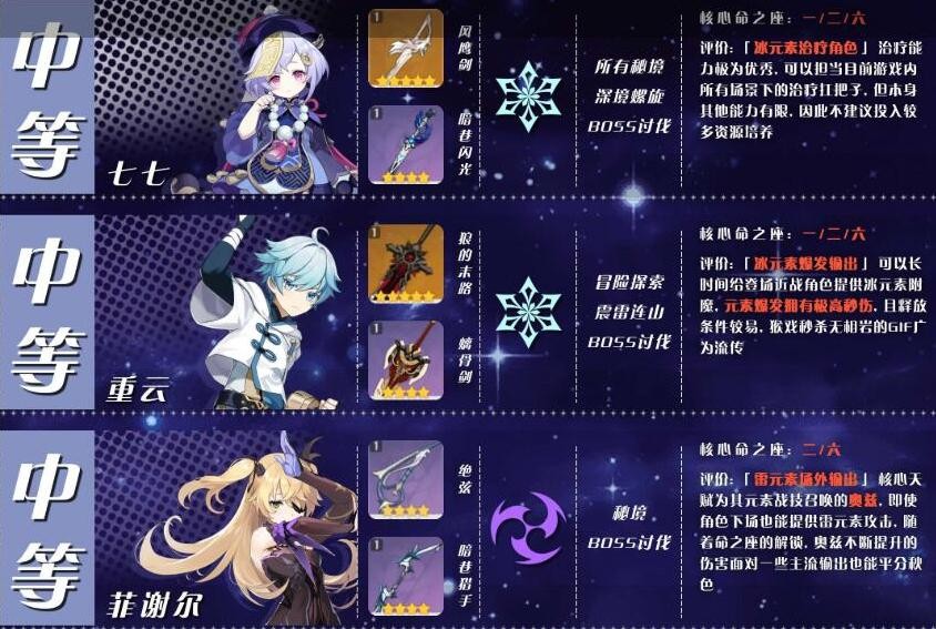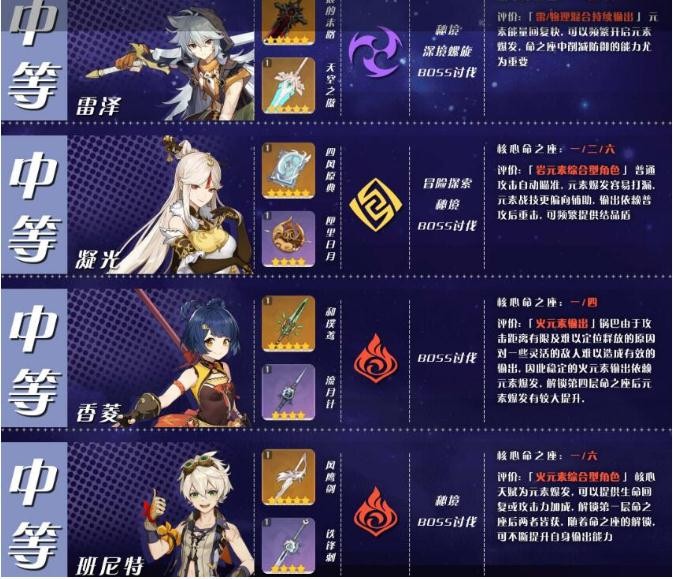 「班尼特」:三测榜单中未考虑到班尼特在输出向的可行性,因此在重新评估后,班尼特也可归类为推荐度中等的角色中。