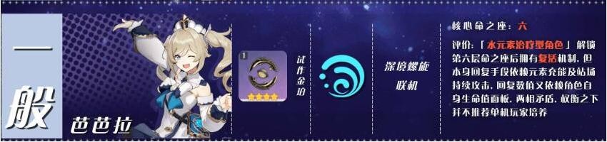 芭芭拉:技能机制一被更改,血量恢复依靠角色站桩输出,又跟生命值挂钩,攻击与生命属性面板权衡之下,实在不推荐单机培养;