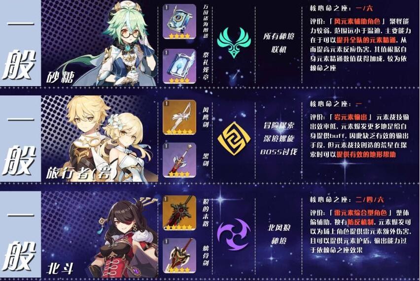 一般:正常情况下不推荐投入大量资源培养的角色,通常表现为缺乏特点,角色强度方面较易被替代