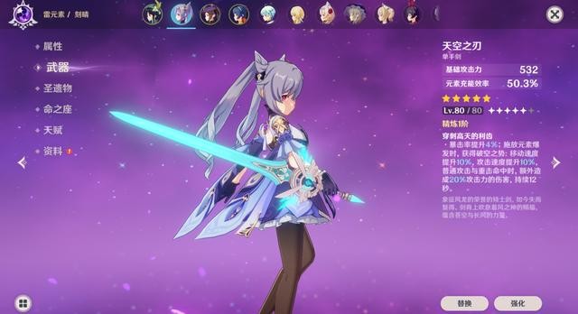 首先这个版本就不是单手剑的天下,【天空之刃】空有面板,技能一般;【风鹰剑】效果还算不错,但并不适合刻晴的输出方向;【匣里龙吟】非常适合刻晴,但可惜这只是一把四星武器。所以在装备方面,刻晴就要比其他五星角色略逊一筹;再加上单手剑不能破盾,打木盾得换火、打岩盾得换双手剑,这就显得非常的尴尬与无力。