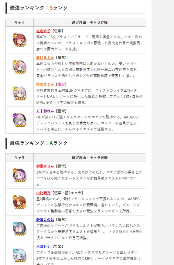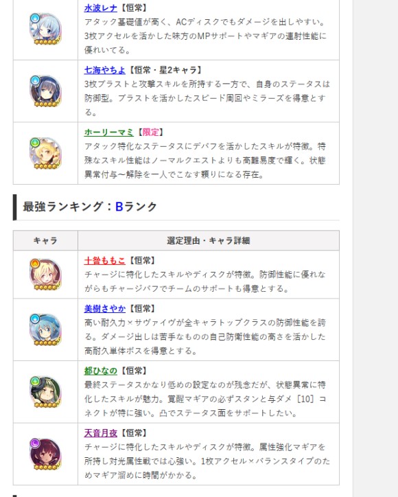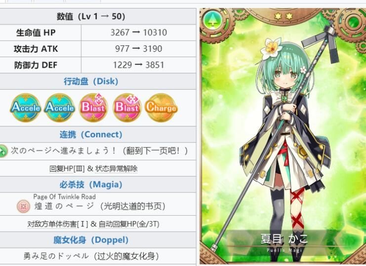 高攻击固然是一个好打手必备的能力,但玲奈又得天独厚具有AAA的Disk,可接连不断使用魔法输出很高的持续火力,相当好用,因此我认为可以担任多数队伍的核心。游戏开局前中期即使其他队友都二星很弱也没关係,靠她一个人集魔法自干就够推到后期难关了。连携的辅助能力也很不错,可以强化队友的攻击力与MP,还附赠爆击,配合群攻BBB的队友正好可以补足玲奈较贫弱的多体伤害。攻高集魔快好开局,不用依赖队友,连携又强,因此个人对玲奈的评价很高。3A型的缺点是B卡只有一张,不适合一般小怪多的地图,但是3A型能帮助集Magia在攻略难度关卡时作为队员非常优秀实用。