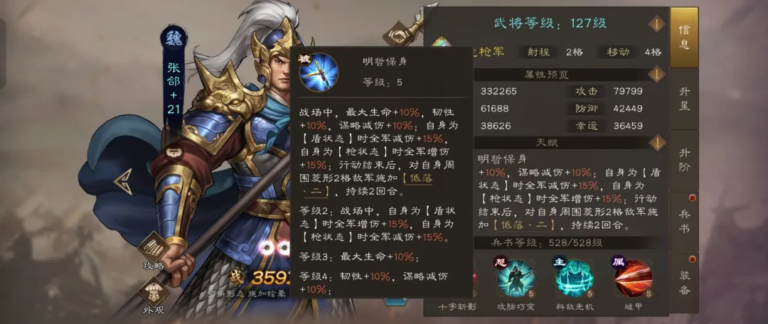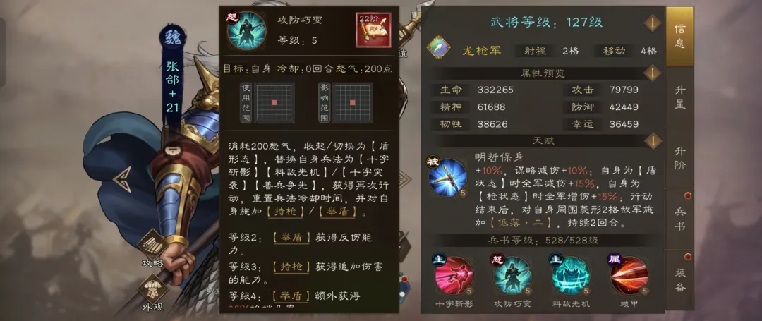 张郃天生具备20%韧性(抗暴击/控制)和20%谋略减伤,生存能力显著提升。形态切换时为全队提供增益:盾牌模式减少15%全队伤害,长枪模式增加15%全队输出,形成攻防双核驱动。