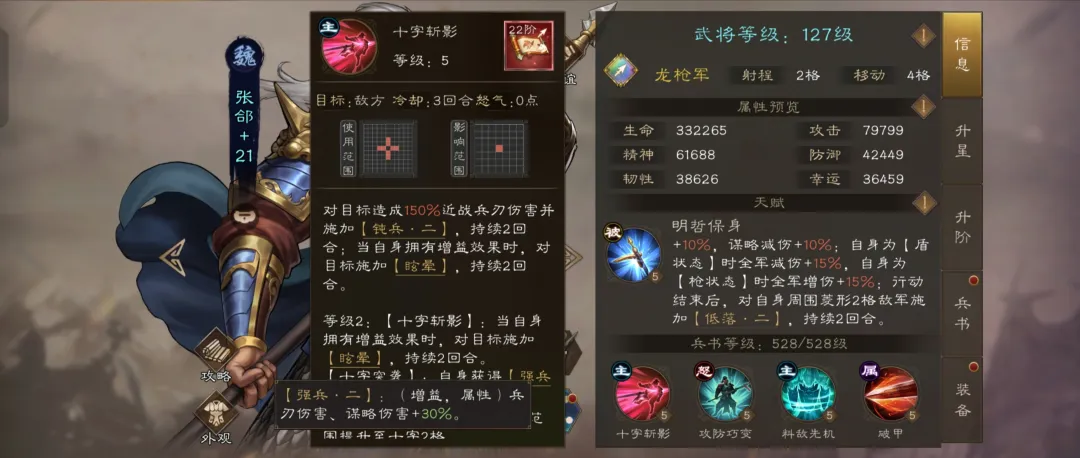 对十字7格内敌人造成150%兵刃伤害,附加【钝兵·二】降低30%攻防。若张郃携带正面buff,额外触发2回合眩晕控制。技能释放后自身获得【强兵·二】提升30%攻防,持续3回合。