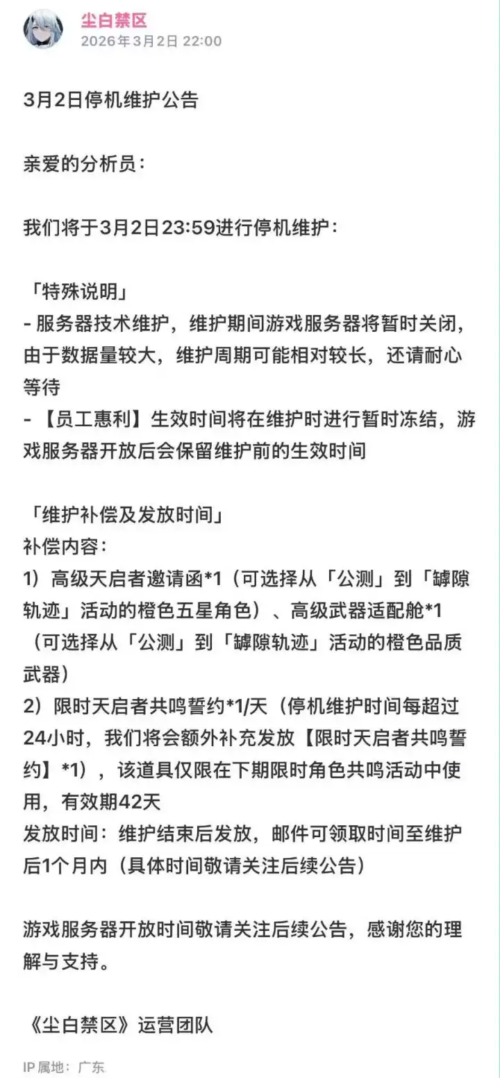尘白禁区在玩家群体中热度颇高,其服务器的一举一动都备受瞩目。3月2日晚十点,尘白禁区运营团队发布的一则公告,让众多玩家瞬间紧张起来,原来游戏即将开启无限期停服维护,这一动态迅速在游戏圈内掀起波澜。
