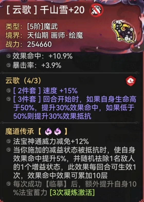 仙画魔画统一推荐云歌套,增加效果命中和速度。速攻画以速度为重,属性优先级为速度>效果命中>效果抵抗>生命率=防御率>其它;铁桶画以效果命中为重,属性优先级为效果命中>效果抵抗=速度=生命率=防御率>其它。