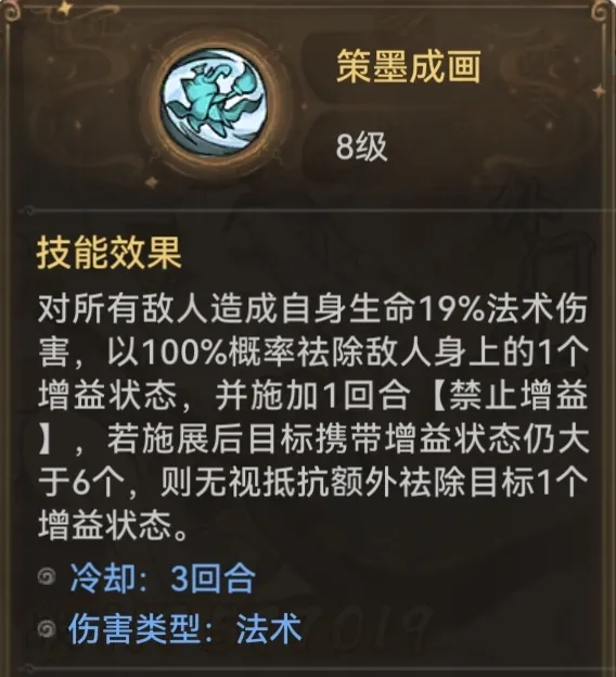 职业主动技能策墨成画,能祛除敌方增益并施加禁止增益状态,目标增益多时还能额外祛除,是关键技能;职业被动技能黯改,在普通画师基础上,每回合开始清除敌方后排免疫状态,施加减益,自身获霸格,对敌方后排威胁大。