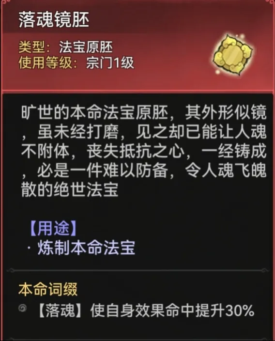 本命原胚只推荐增加效果命中的落魂镜胚。速攻画法宝推荐四阶羽加三阶玉,全炼化速度或部分速度部分效果命中/生命率;铁桶画法宝推荐四阶羽加三阶藤,炼化速度达一速后,其余炼化效果命中/生命率。
