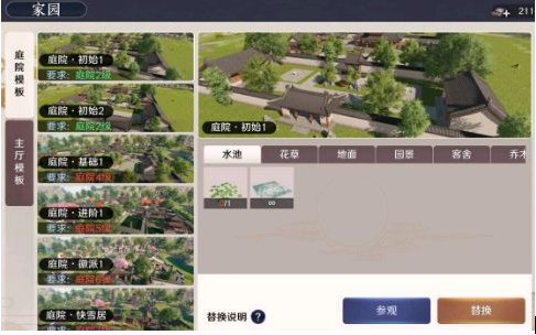 模板中分为庭院模板以及主厅模板,完美的照顾了非休闲玩家的游戏体验,可以选用模板来布置家园。这里值得一说的是模板的替换说明: